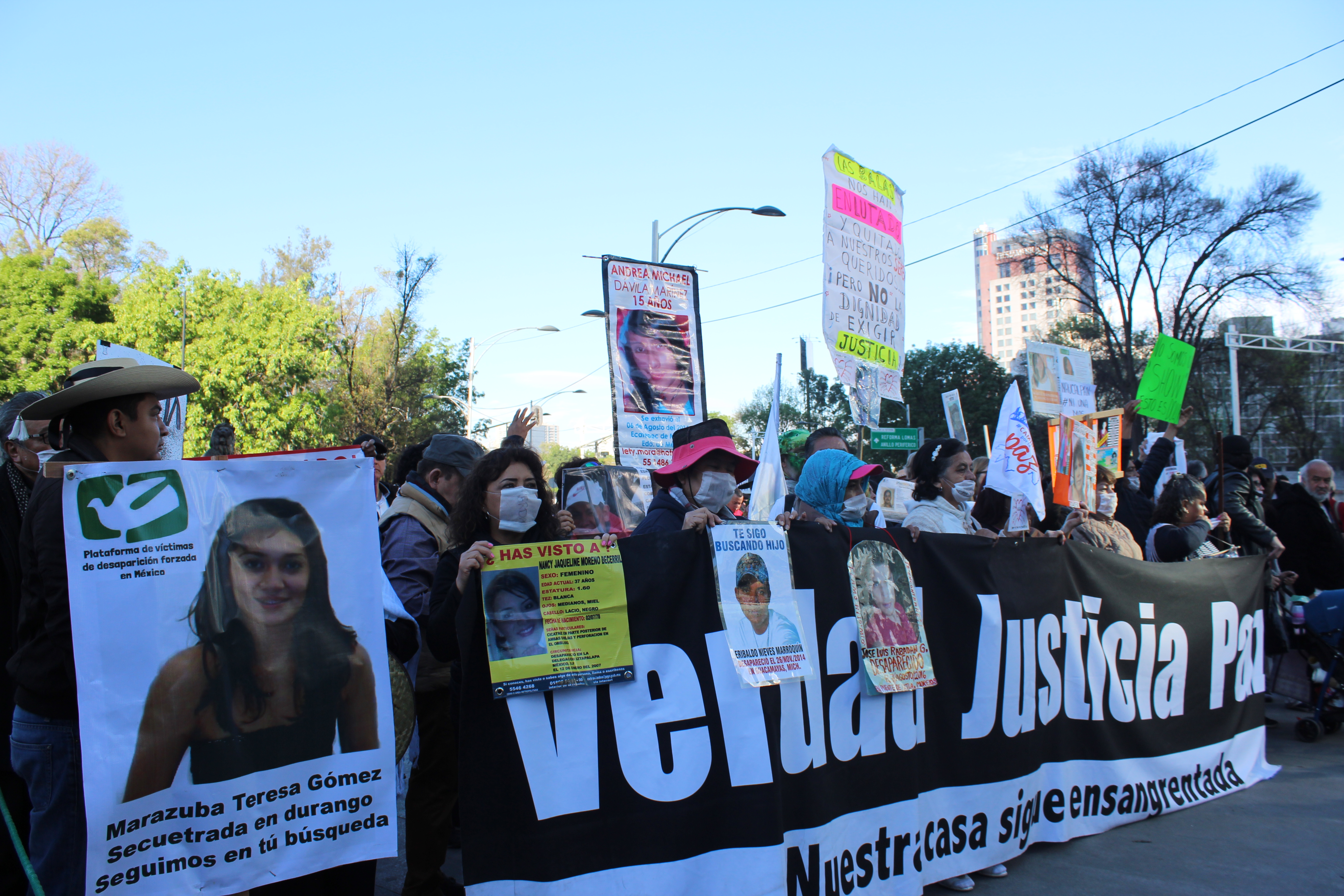 Fotografía de la Caminata por la Verdad, Paz y Justicia convocada por Javier Sicilia y la familia LeBarón que partió de Cuernavaca, Morelos y culminó en el Zócalo de la Ciudad de México. En la imagen manifestantes exigen justicia.