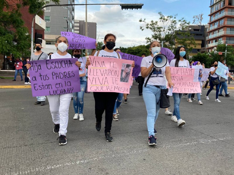 Fotografía de familiares exigiendo justicia por Abigail Fernández Robles y David García Saavedra desaparecidos en Jalisco. En la imagen la marcha convocada que partió de Palacio de Gobierno a la Glorieta de las y los Desaparecidos de Jalisco.