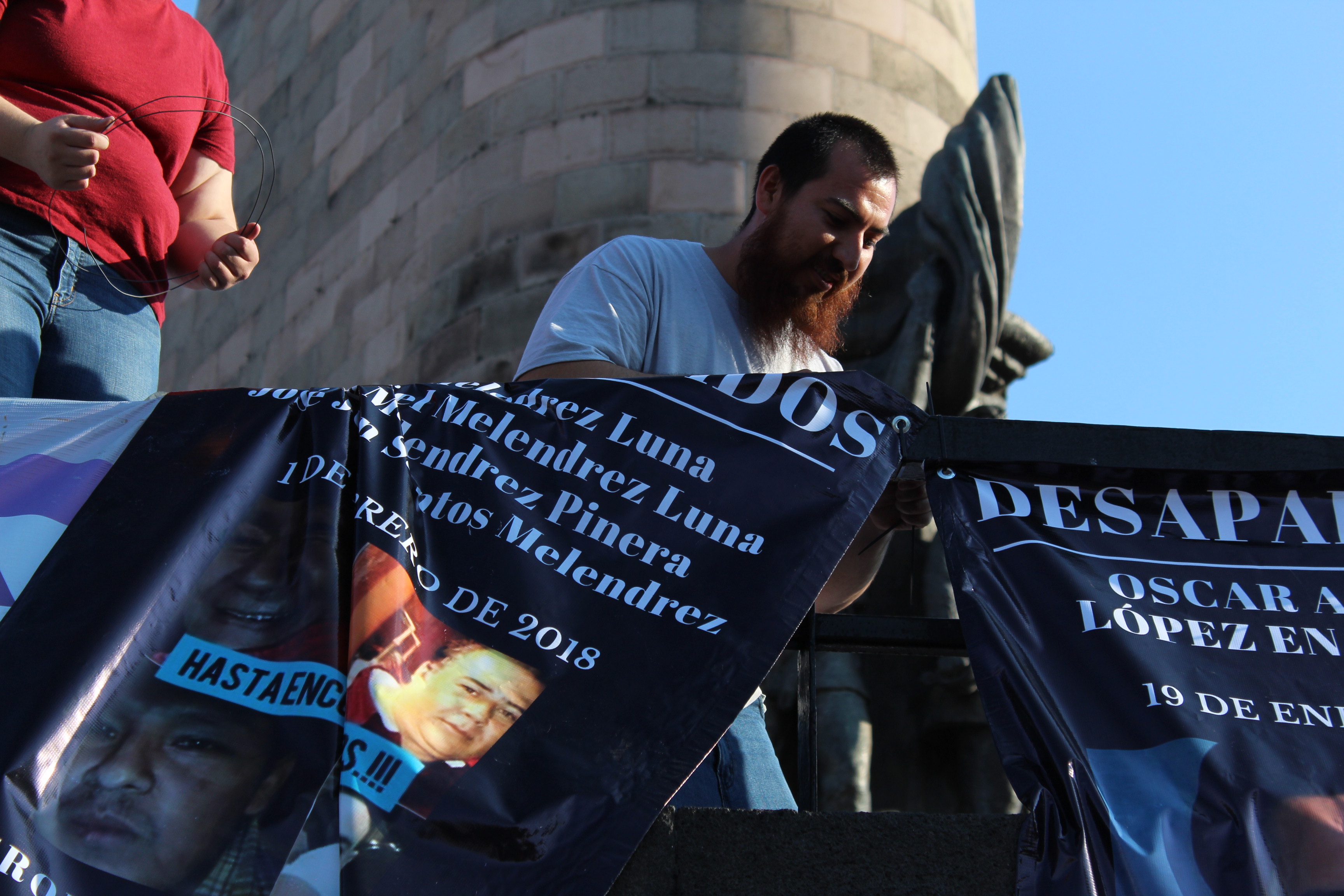 Fotografía del 22 de junio de 2019 donde algunas de las familias de las más de 8 mil 600 personas que han sido desaparecidas en Jalisco, reinstalaron sus lonas de búsqueda en la Glorieta de las y los Desaparecidos de Jalisco.