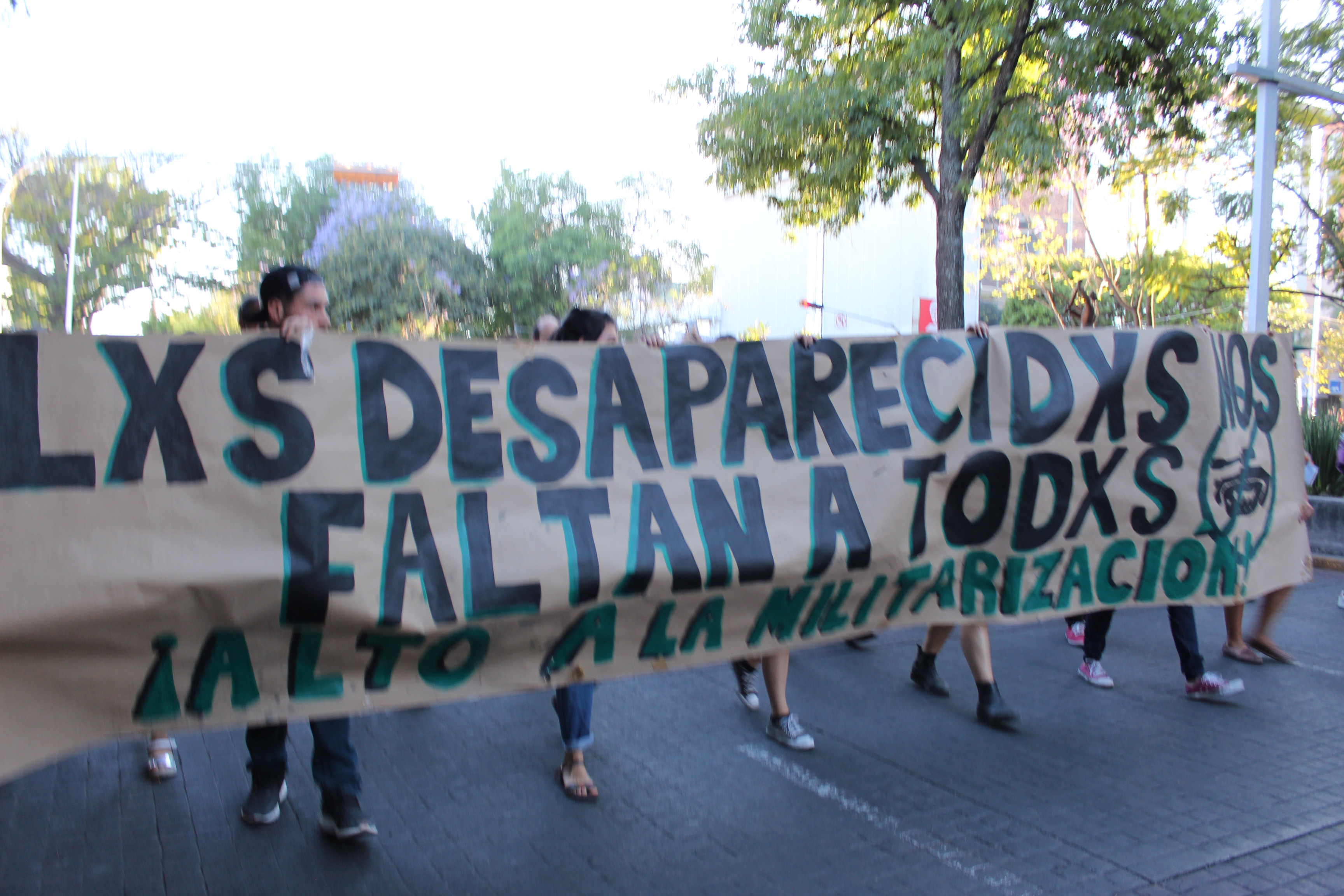 Fotografía al parecer de la marcha en memoria de la desaparición forzada de Marco, Salomón y Daniel, estudiantes de la Universidad de Medios Audiovisuales (CAAV) en Guadalajara. En la imagen participantes piden un alto a la militarización.