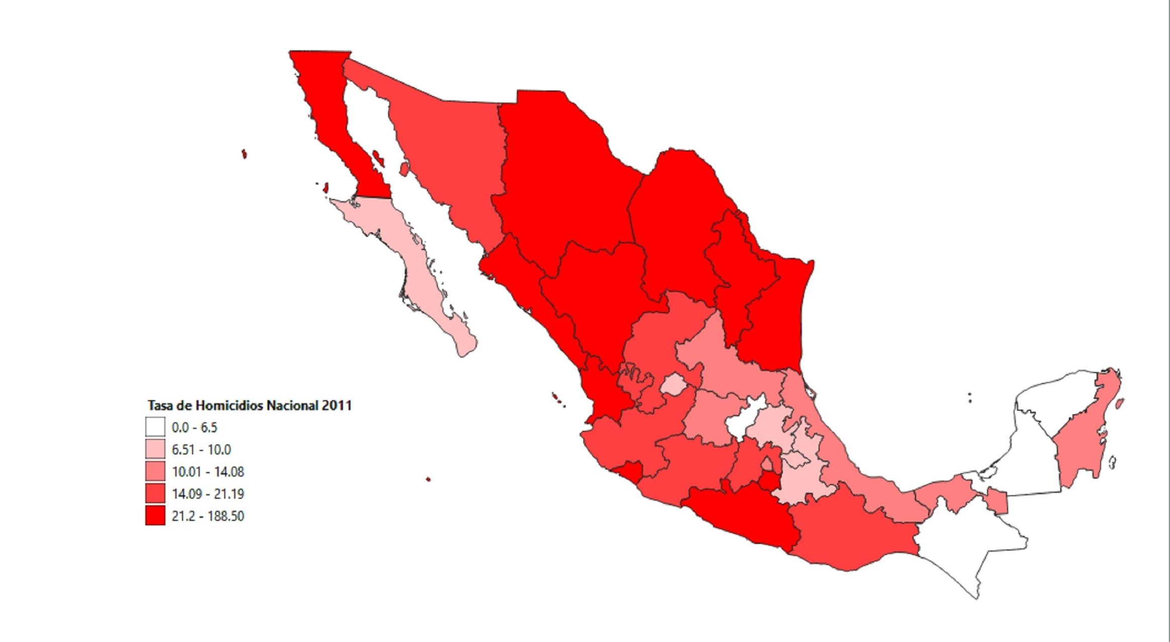 El mapa presenta la tasa de homicidios nacional durante el 2011 por cada 100 mil habitantes, se muestra a nivel estatal en grupos de violencia. El mapa elaborado con información del Instituto Nacional de Estadística y Geografía (INEGI) señala a cuatro entidades dentro del primer quintil, con menos homicidios y 11 dentro del más violento. La imagen pertenece a la investigación de El contexto de violencia en Veracruz: Homicidios y desapariciones en la entidad,1990-2017.