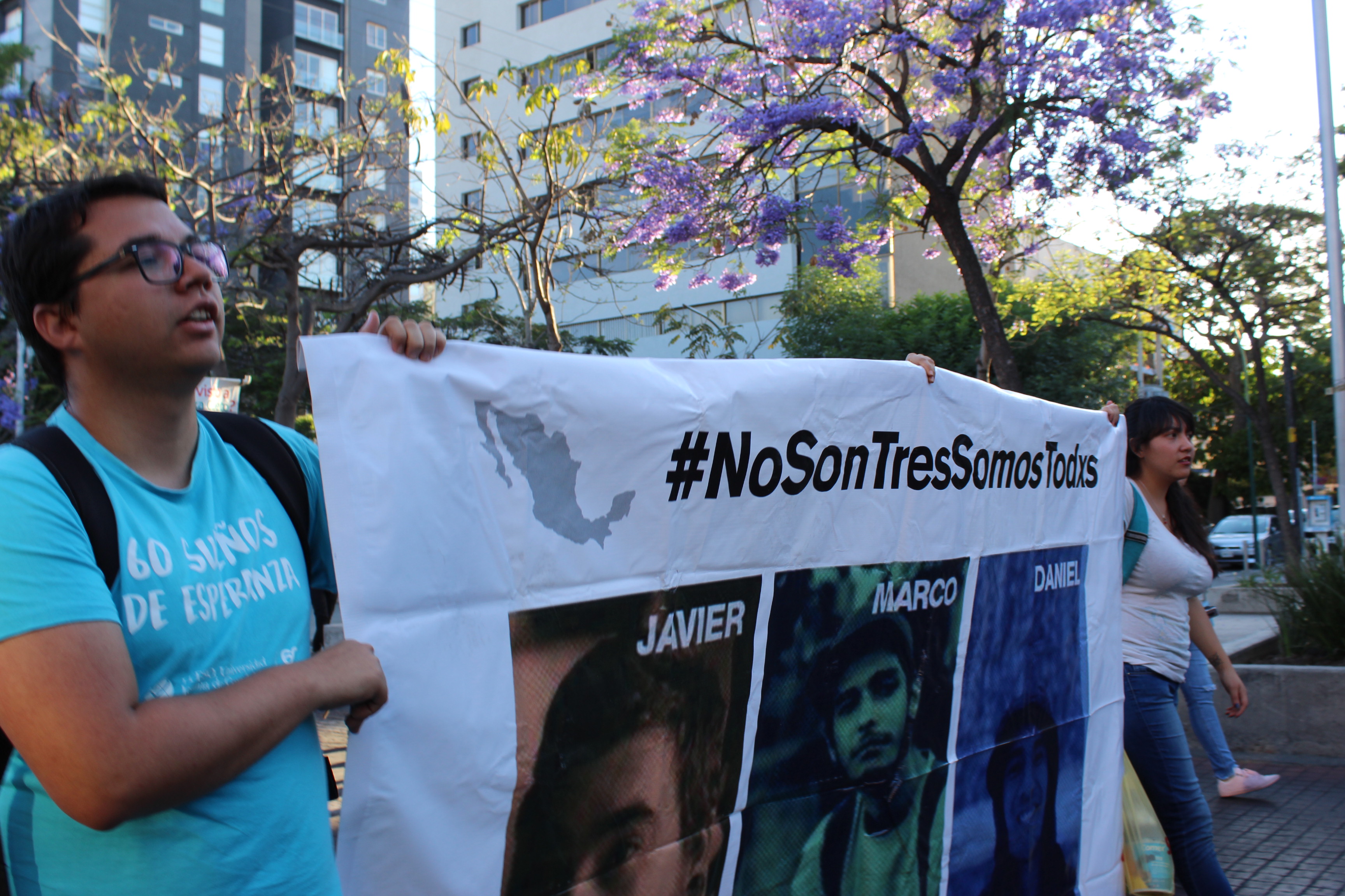 Fotografía al parecer de la marcha en memoria de la desaparición forzada de Marco, Salomón y Daniel, estudiantes de la Universidad de Medios Audiovisuales (CAAV) en Guadalajara.