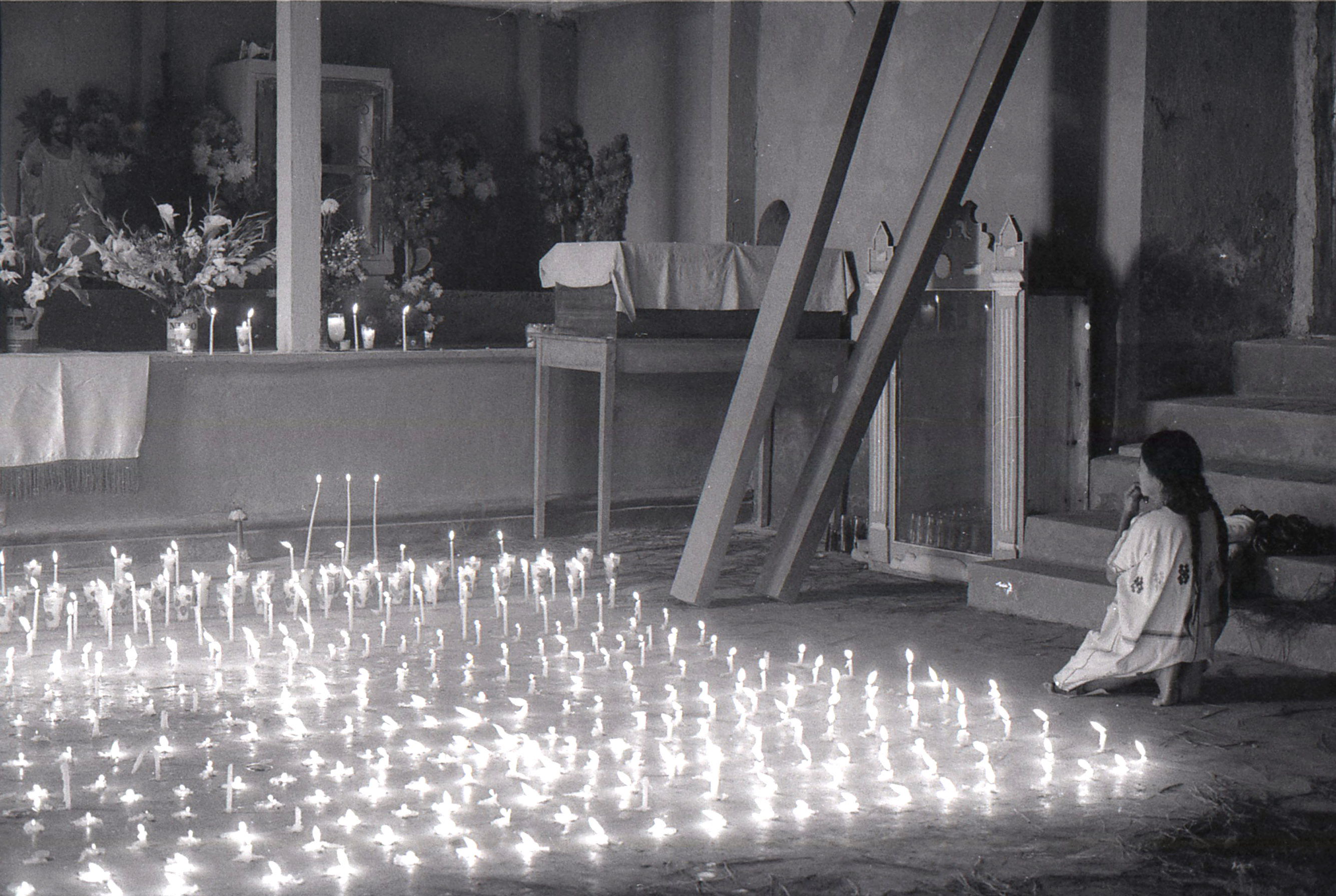Mujer reza junto a velas en la Parroquia de San Pablo de Chalchihuitán