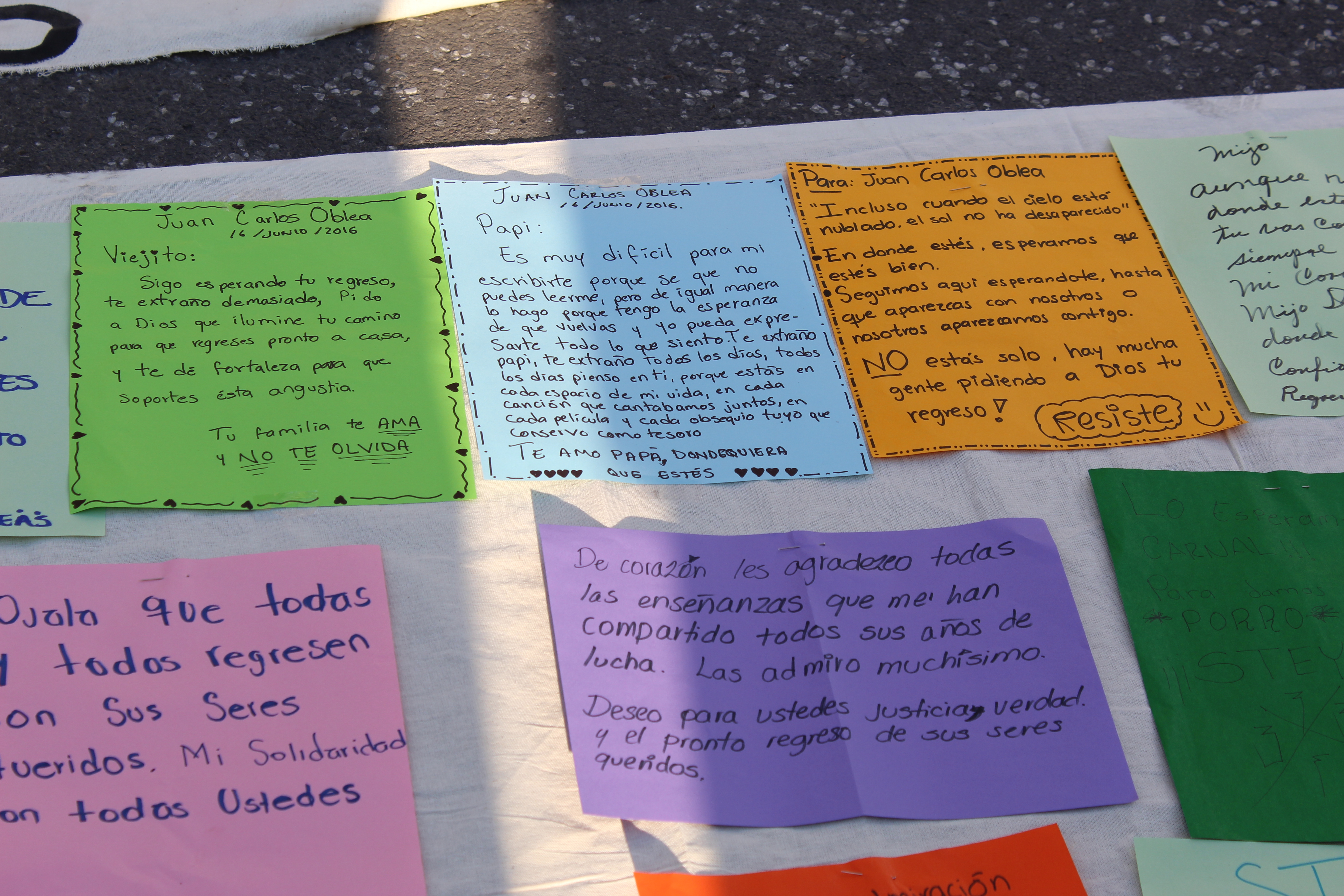 Fotografía de la concentración realizada por el colectivo Por Amor a Ellxs junto con otros colectivos y organizaciones afuera del Teatro Degollado para exigir justicia por sus familiares desaparecidos con motivo del Día Internacional de Víctimas de Desaparición Forzada el 30 de agosto de 2019. En la imagen mensajes de esperanza.