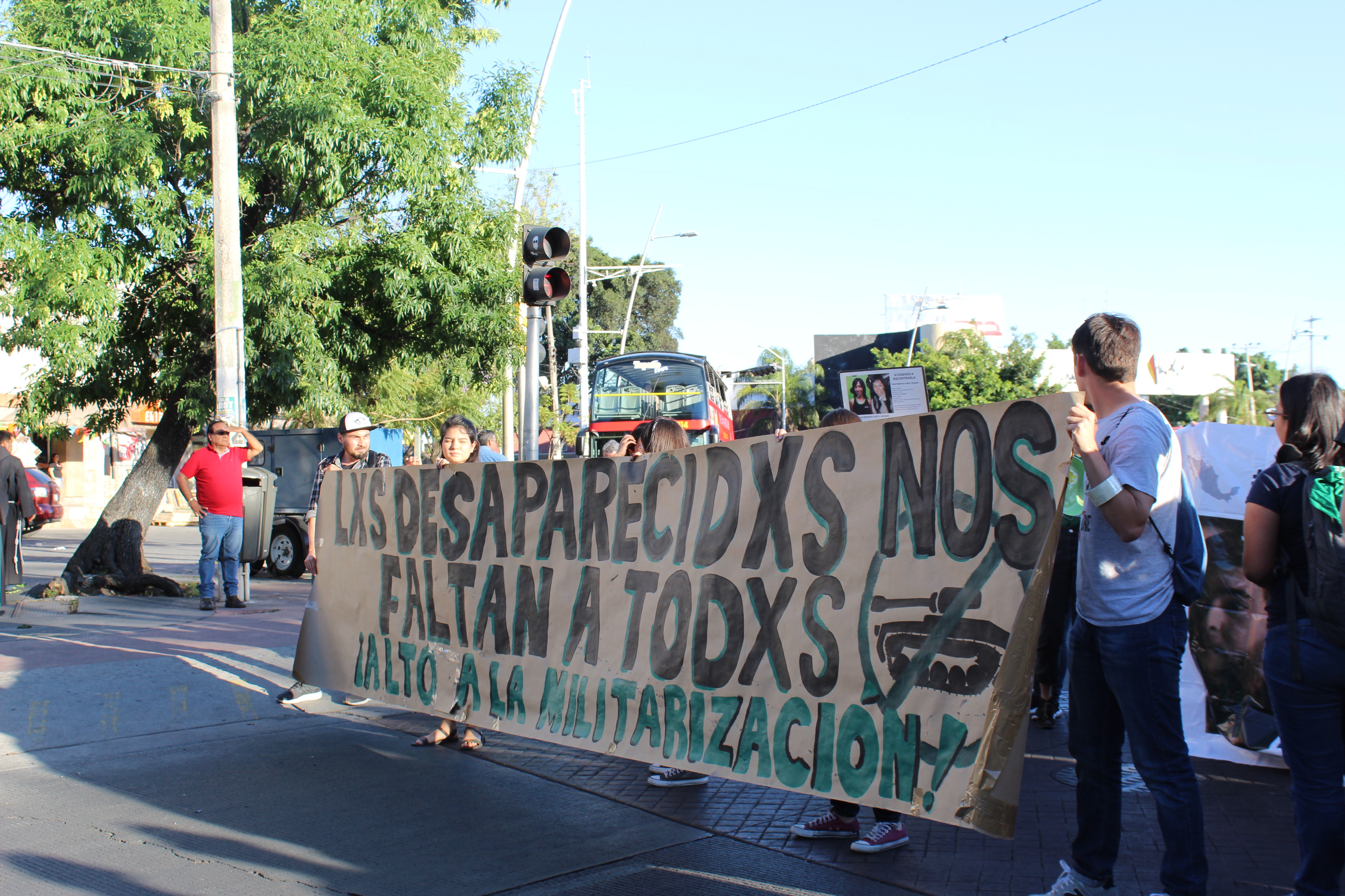 Fotografía al parecer de la marcha en memoria de la desaparición forzada de Marco, Salomón y Daniel, estudiantes de la Universidad de Medios Audiovisuales (CAAV) en Guadalajara. En la imagen participantes piden alto a la militarización.