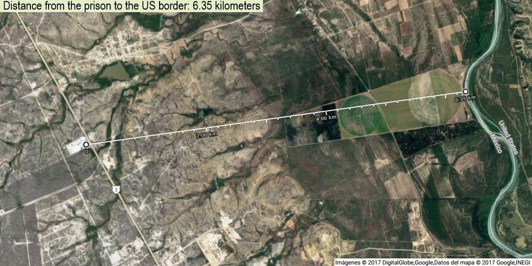 Mapa satelital de la distancia entre el Penal de Piedras Negras y la frontera con Estados Unidos