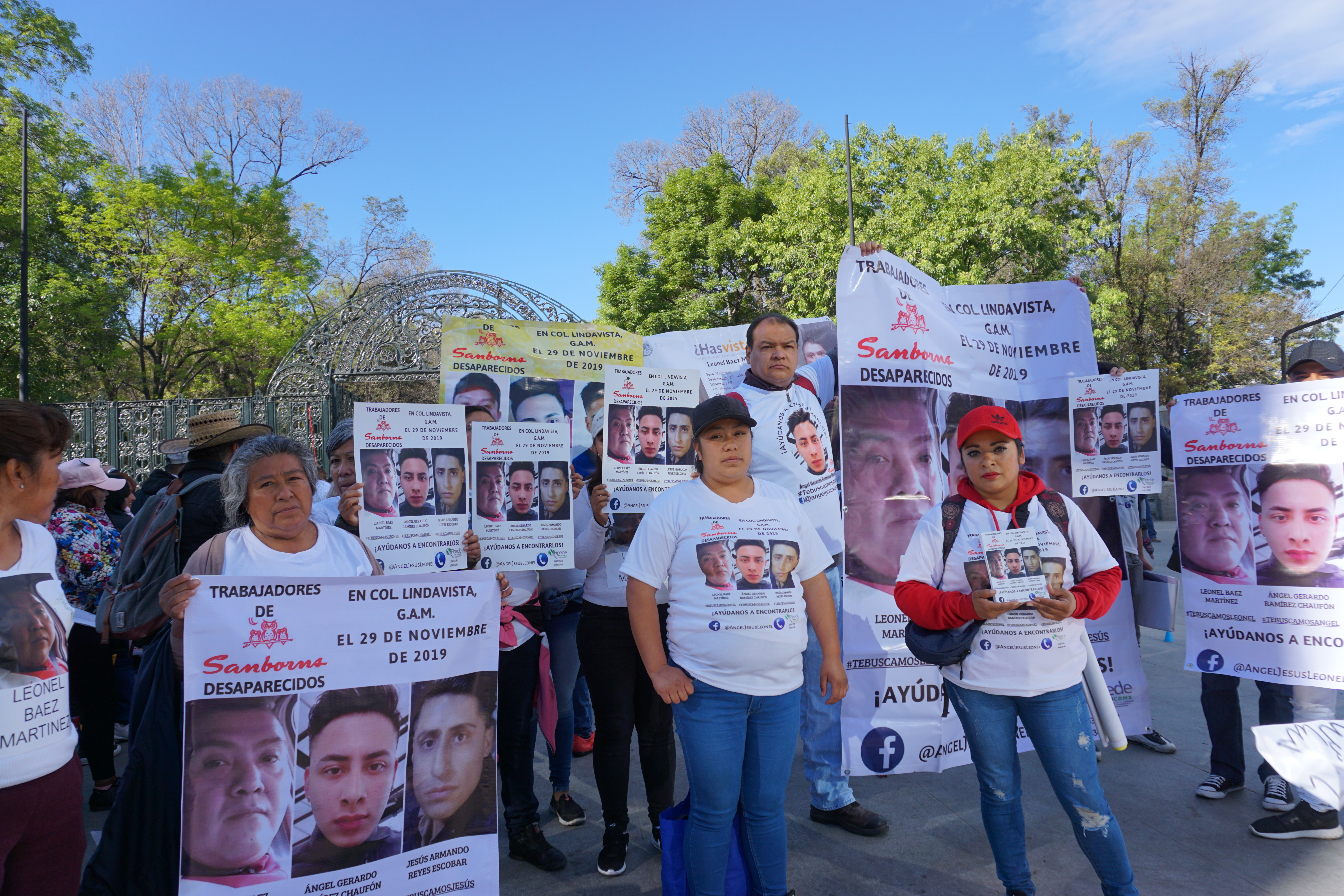 Fotografía de la Caminata por la Verdad, Paz y Justicia convocada por Javier Sicilia y la familia LeBarón que partió de Cuernavaca, Morelos y culminó en el Zócalo de la Ciudad de México. En la imagen trabajadores de Sanborns buscan a sus desaparecidos.