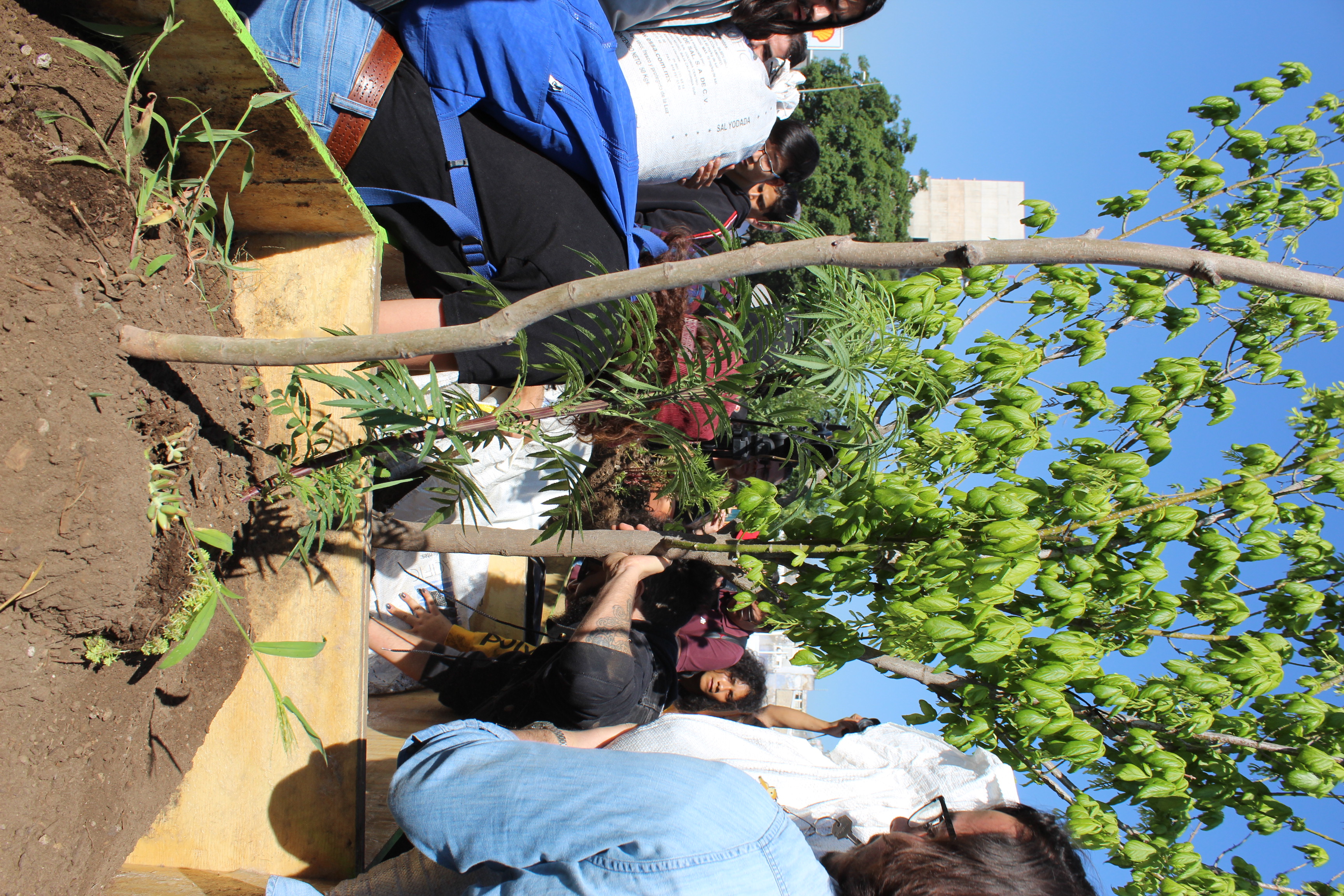 Fotografía de los árboles sembrados en memoria de la desaparición forzada de Marco, Salomón y Daniel, estudiantes de la Universidad de Medios Audiovisuales (CAAV) en Guadalajara. A un año del evento familiares, amigos e integrantes del Colectivo de Acción Artística se manifestaron en la Glorieta de las y los desaparecidos donde colocaron El Jardín de la Memoria.