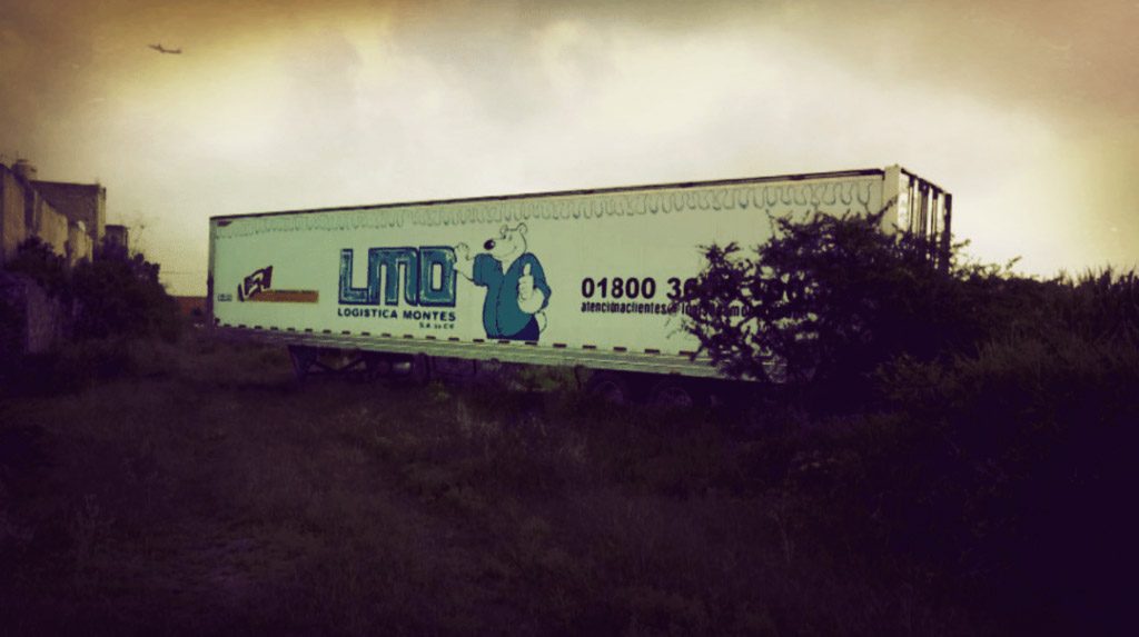 Fotografía de uno de los llamados tráileres de la muerte, un contenedor con 273 cuerpos que se encontraba en un terreno baldío en Tlajomulco de Zúñiga. La imagen fue capturada por Darwin Franco y es parte del reportaje titulado Jalisco: La verdad de los tráileres de la muerte.