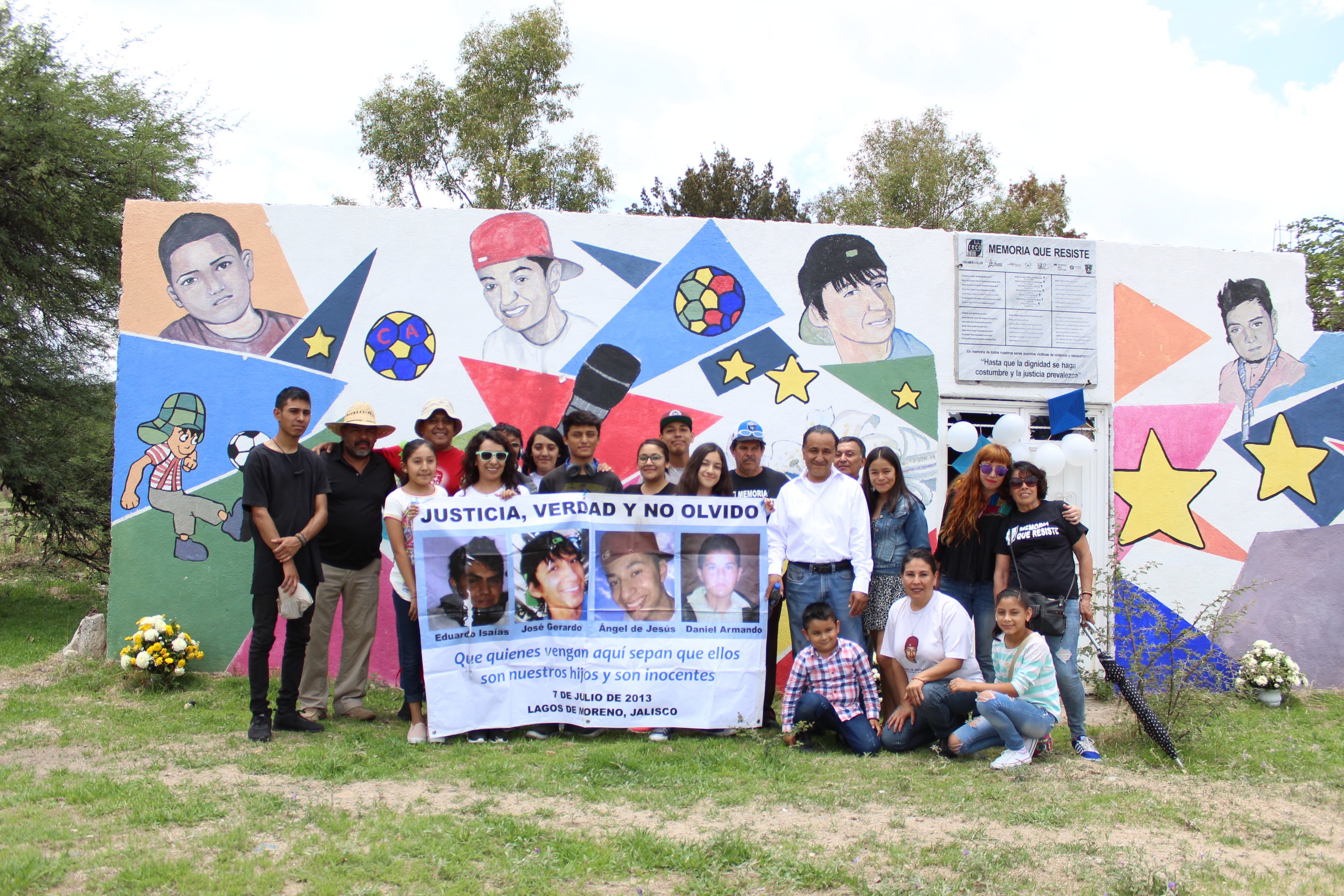 Fotografía de la acción de memoria realizada por las familias de Lagos de Moreno para exigir justicia, verdad y no olvido de los acontecimientos ocurridos la madrugada del 7 de julio de 2013 en el lugar donde seis jóvenes y un adulto estuvieron con vida por última vez. En la imagen las familias sosteniendo una lona con los rostros de cuatro de las siete víctimas.