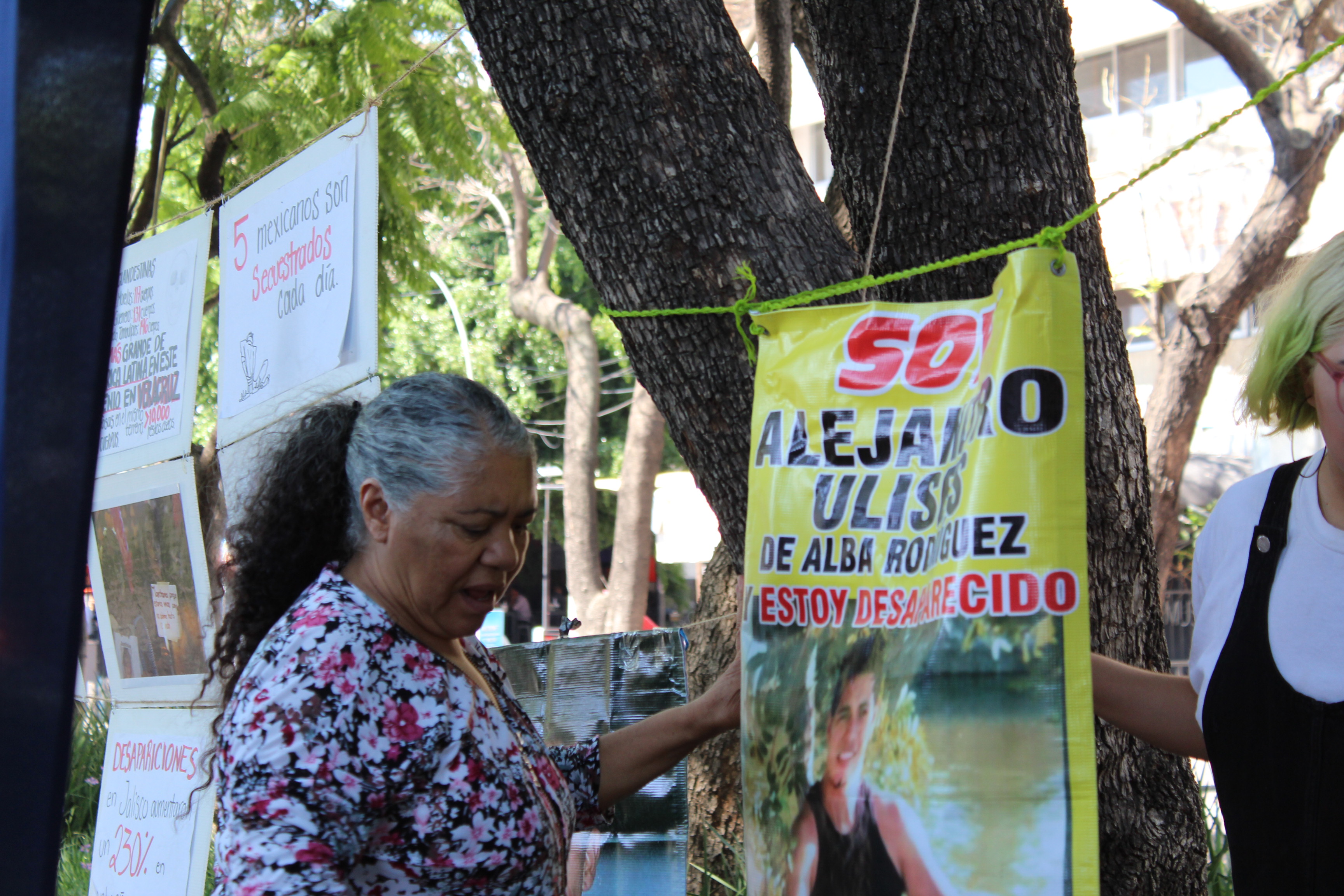 Fotografía del 22 de junio de 2019 donde algunas de las familias de las más de 8 mil 600 personas que han sido desaparecidas en Jalisco, reinstalaron sus lonas de búsqueda en la Glorieta de las y los Desaparecidos de Jalisco. En la imagen familiares cuelgan lonas de búsqueda.