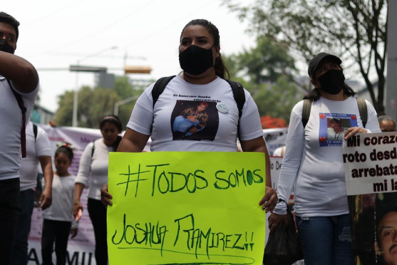 Fotografía en el marco del 10 de mayo de 2021 donde los colectivos Entre Cielo y Tierra y Altos Sur Jalisco en Busca de Ti realizaron diversas acciones para exigir la búsqueda y regreso de sus familiares. En la imagen un participante sostiene un cartel por Joshua Ramírez durante la marcha que se realizó en Guadalajara, Jalisco, el 9 de mayo.