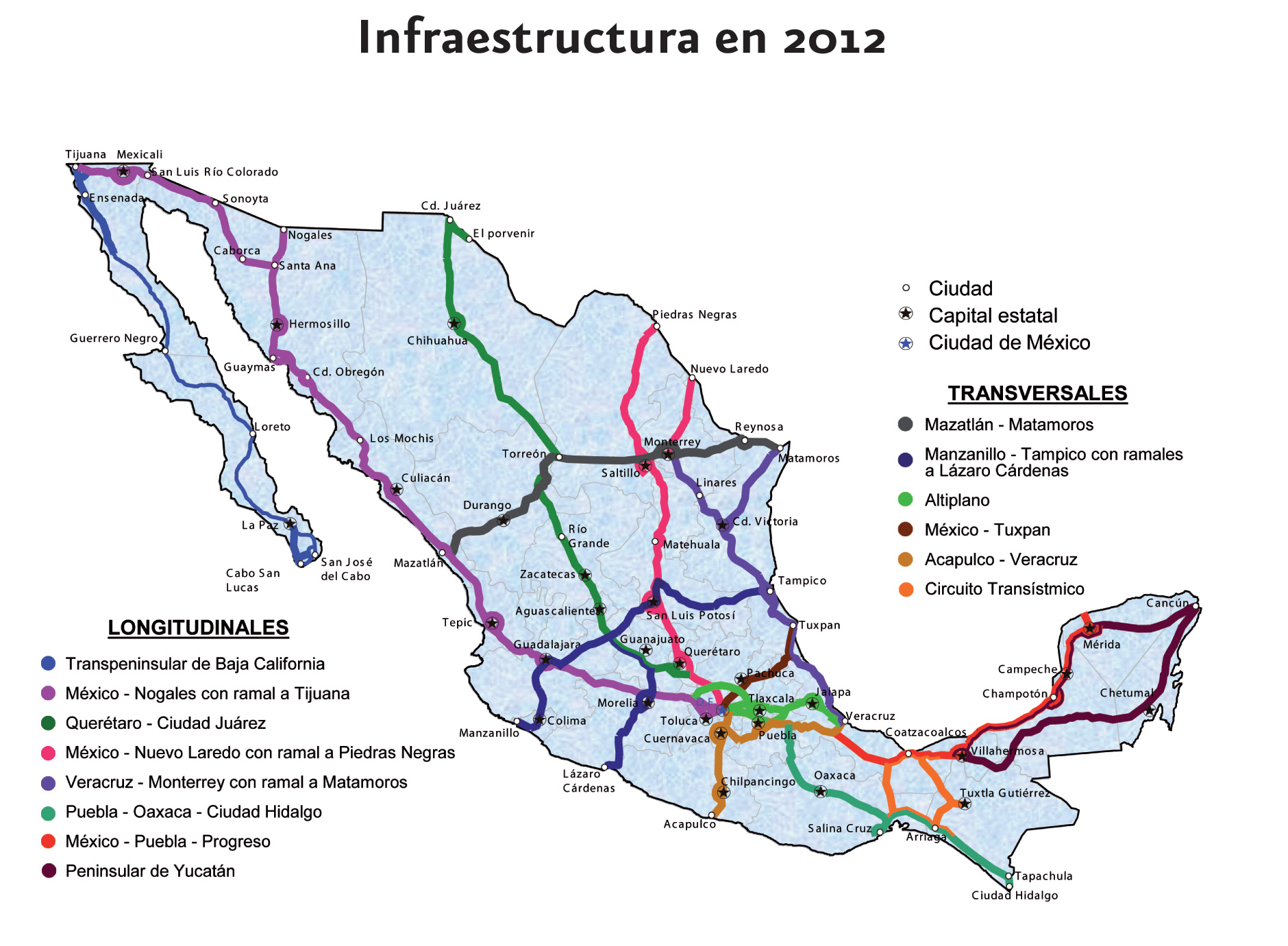 Mapa con la red de infraestructura carretera en el año 2012. Contiene información de las vías longitudinales y transversales que conforman el sistema carretero.