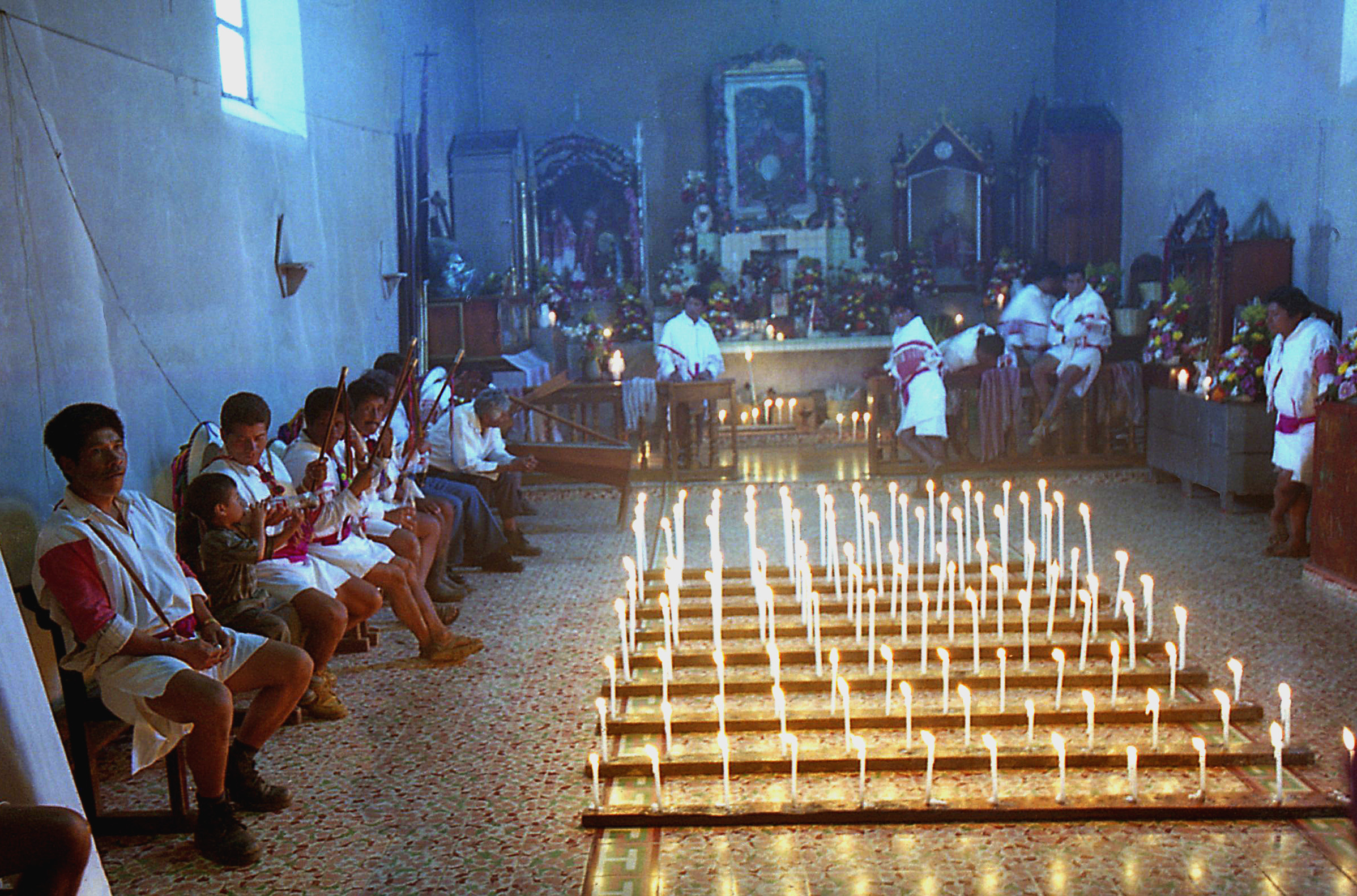 Martomas con bastones y ofrenda de velas durante la Fiesta Grande en el templo de Santa Martha, Chenalhó