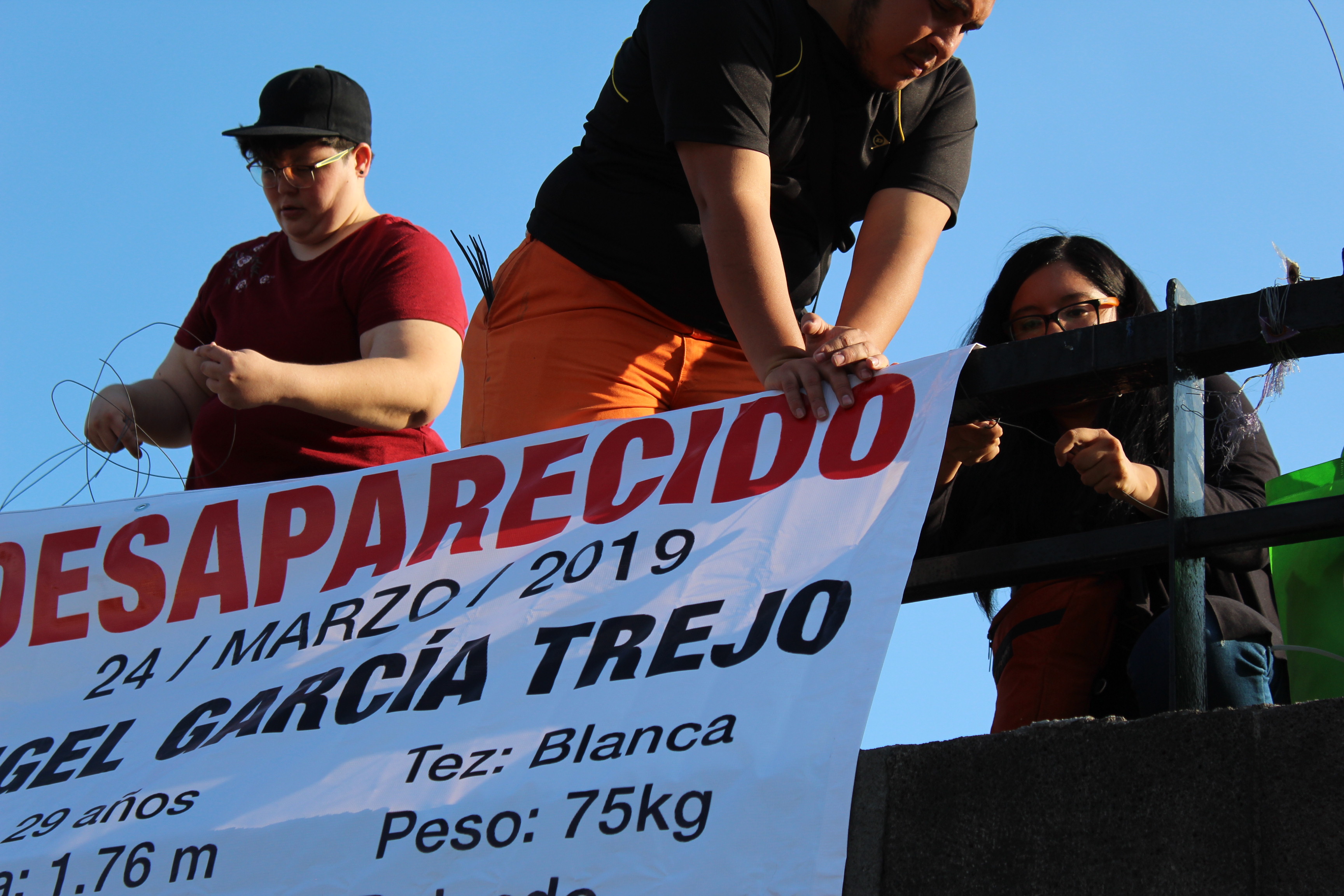 Fotografía del 22 de junio de 2019 donde algunas de las familias de las más de 8 mil 600 personas que han sido desaparecidas en Jalisco, reinstalaron sus lonas de búsqueda en la Glorieta de las y los Desaparecidos de Jalisco. En la imagen los manifestantes cuelgan la lona de Ángel García Trejo.
