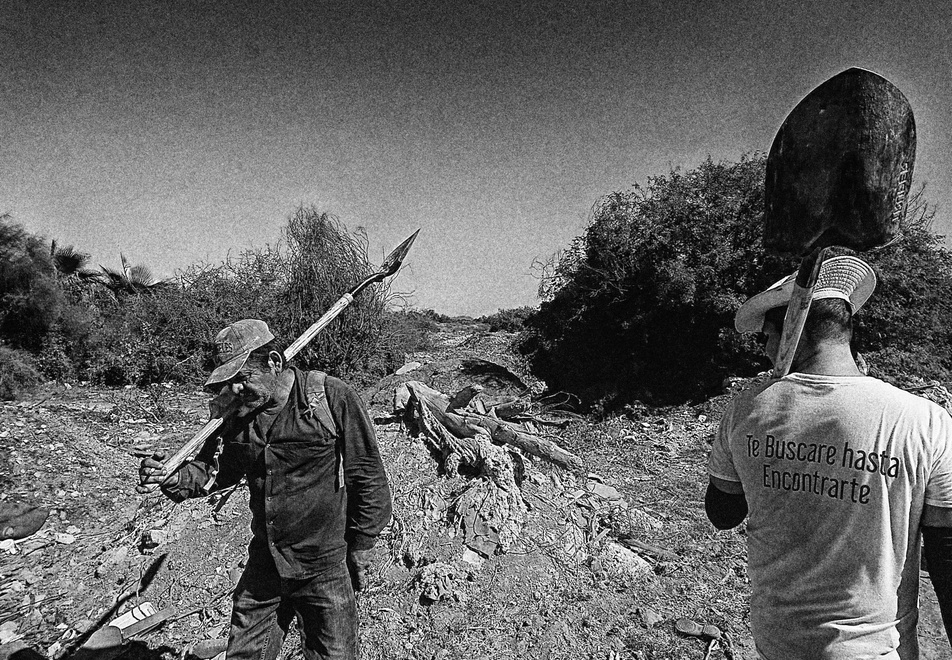Fotografía de algunos de los hombres pertenecientes a las Rastreadoras de El Fuerte, en Sinaloa, quienes buscan cuerpos en fosas clandestinas a quienes llaman sus tesoros. La imagen aparece en el reportaje que cuenta el día que hallaron nueve de ellos.