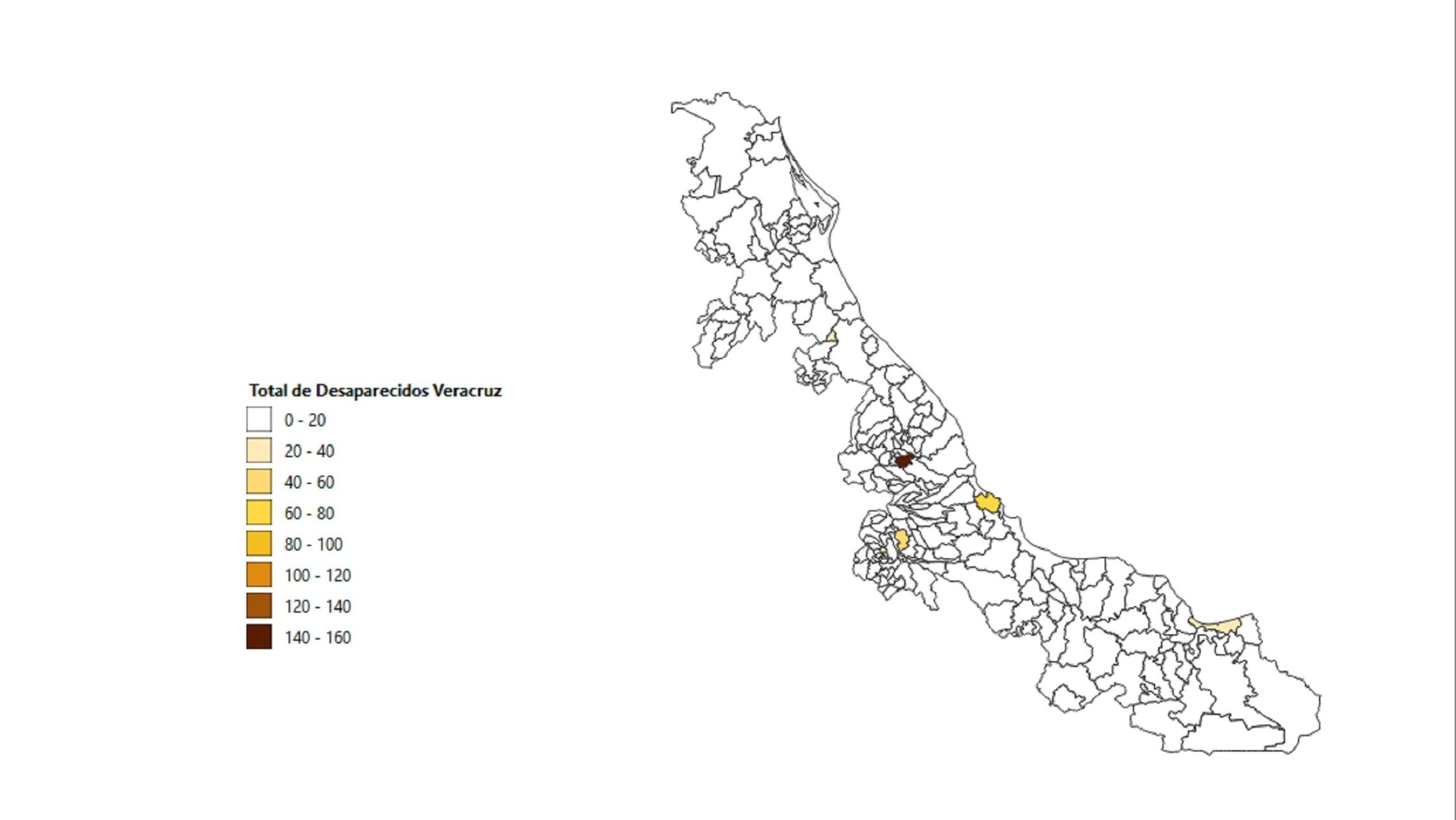El mapa muestra el panorama de la desaparición en Veracruz. Contiene el total de personas desaparecidas en la entidad y señala el rango por municipio. La imagen pertenece a la investigación de El contexto de violencia en Veracruz: Homicidios y desapariciones en la entidad,1990-2017.