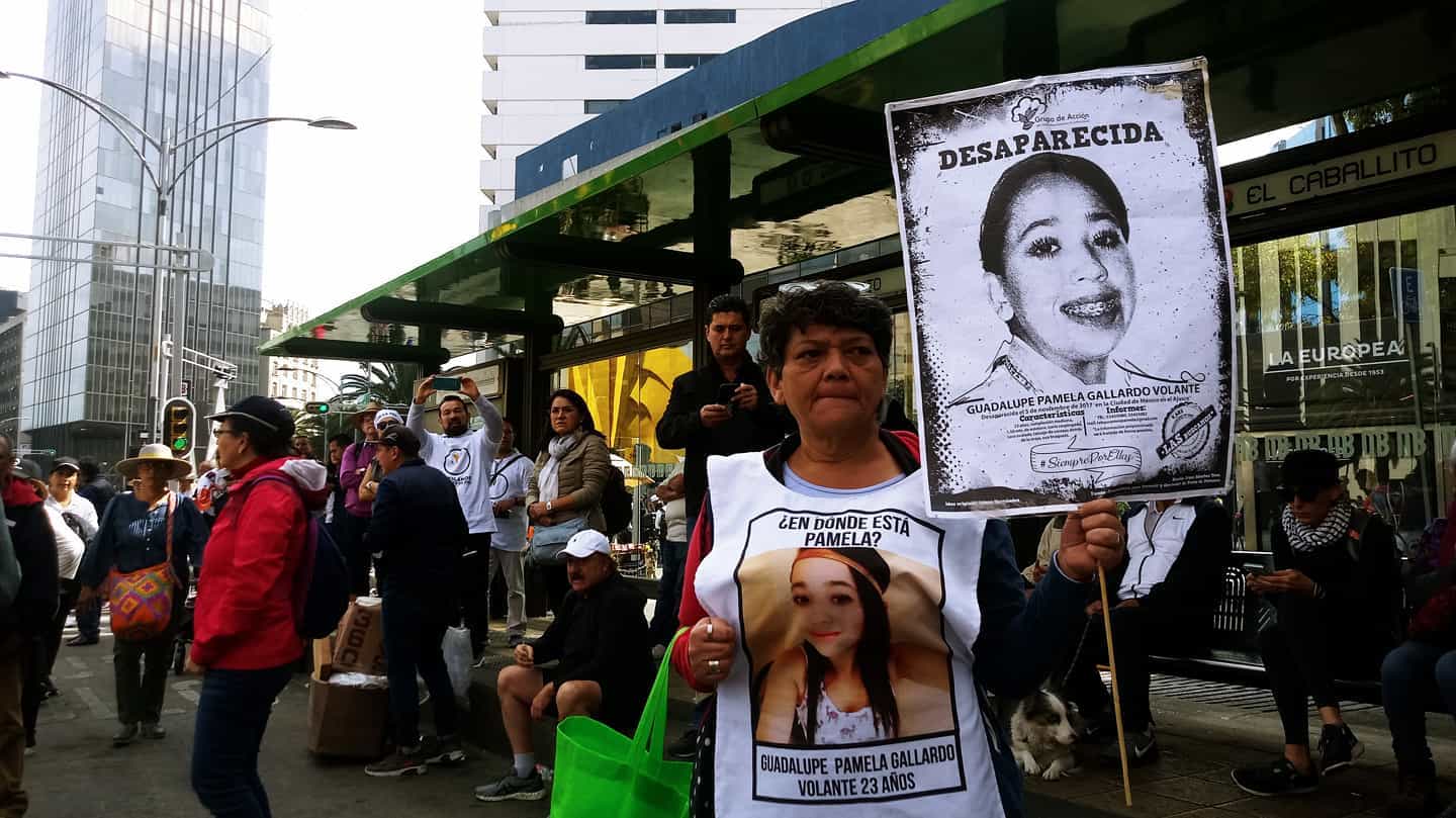 Fotografía de la Caminata por la Verdad, Paz y Justicia convocada por Javier Sicilia y la familia LeBarón que partió de Cuernavaca, Morelos y culminó en el Zócalo de la Ciudad de México. En la imagen familiar busca a Guadalupe Pamela Gallardo.