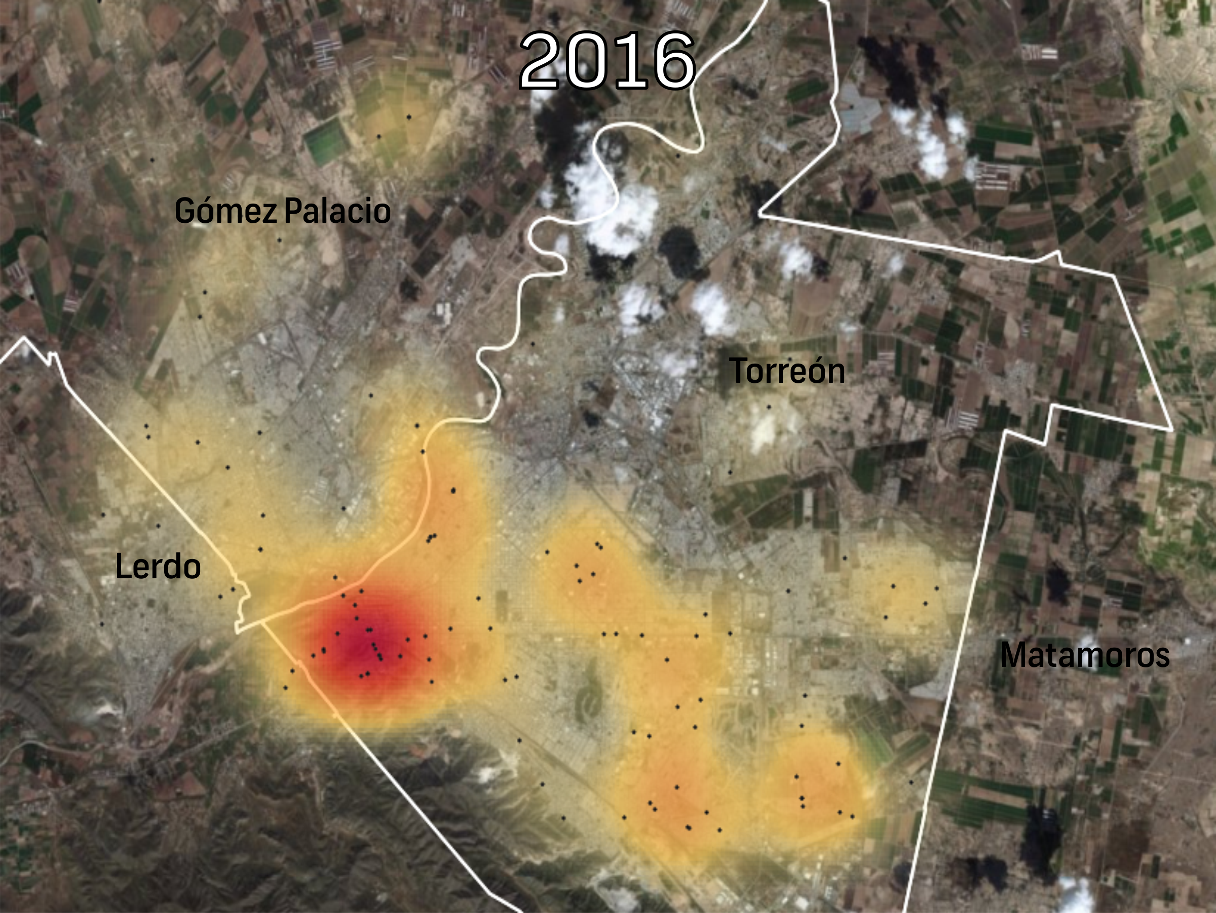 Mapa de calor que muestra el sitio en que ocurrieron homicidios en la Zona Metropolitana de La Laguna en el año de 2016, sin indicadores.