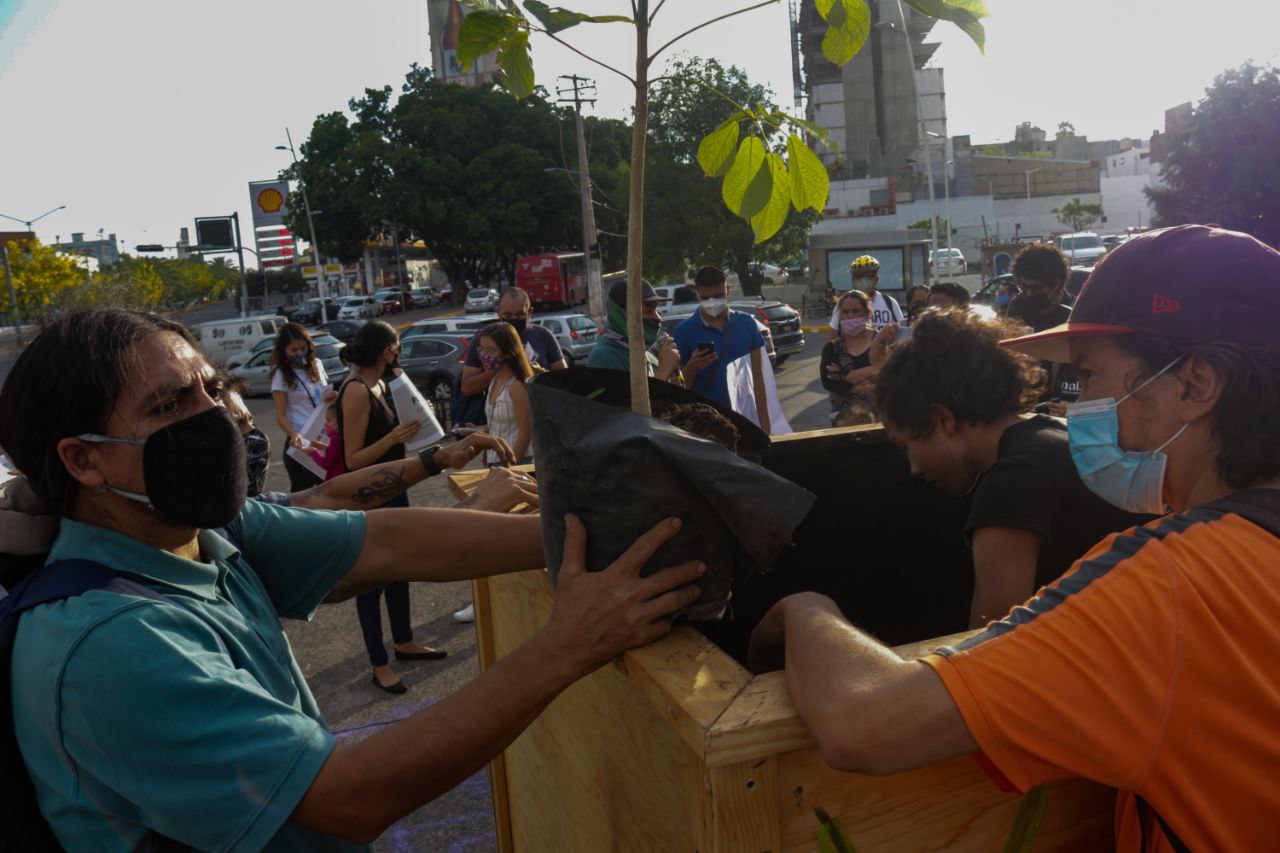 Fotografía de la colocación del árbol primavera sembrado en una jardinera